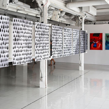Texte écrit au sol en dessous des affiches : Au Canada, le nombre de féminicides a augmenté de 20 % par rapport à 2019, une hausse qui démontre le fléau de cette problématique sociale. Une femme ou une fille est tuée tous les deux jours. Au Québec, entre 1989 et 2022, 1208 victimes (939 femmes et 269 enfants) identifié.e.s ont été tué.e.s par des hommes (conjoints ou des inconnus). Cette pluie noire, les larmes des victimes, représente leur douleur et les pleurs de leur entourage. Ce déluge est un appel à notre responsabilisation personnelle et collective afin de contrer la violence conjugale. Ouvrir la voix afin de briser le silence, dénoncer, demander du soutien et démontrer qu’il est possible d’entretenir des relations respectueuses.